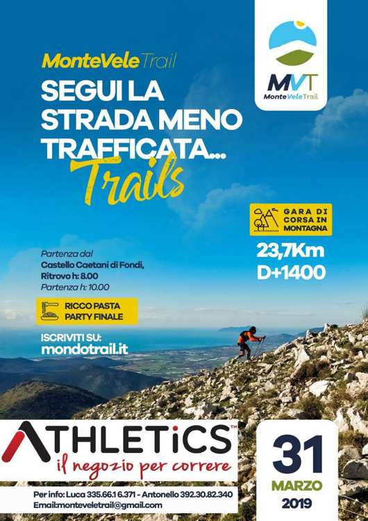 Sono aperte dal 1 gennaio le iscrizioni alla 1° edizione del “Monte Vele Trail”, gara di corsa in montagna che si terrà il prossimo 31 marzo a Fondi. Si tratta della prima edizione di una competizione organizzata da appassionati di questo sport, tutti residenti a Fondi e comuni limitrofi, che in pochi anni ha raccolto un buon numero di adepti al “trail running”, la disciplina cioè che vede gli atleti impegnati in una corsa sui sentieri delle colline e delle montagne in un mix di sport e turismo. Un modo diverso e divertente insomma per godersi i panorami mozzafiato delle catene montuose italiane e non solo.