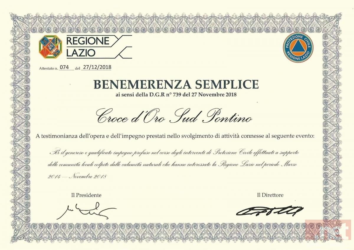 In virtù del servizio reso alla comunità, il 27 dicembre 2018 la Protezione Civile della Regione Lazio, durante un incontro tenutosi a Roma che ha chiamato a raccolta svariate associazioni, ha voluto conferire alla “Croce d’Oro Sud Pontino” un attestato di benemerenza.