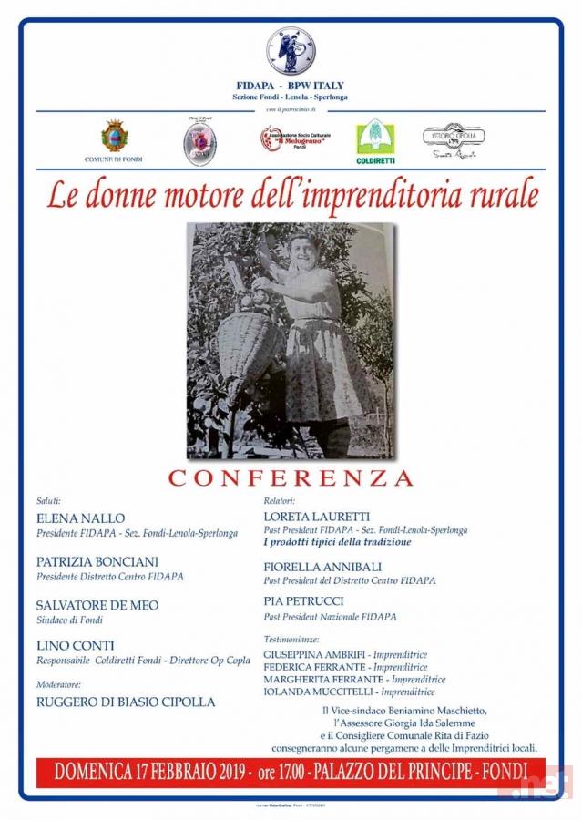 La Sezione FIDAPA Fondi - Lenola - Sperlonga, con il patrocinio del Comune di Fondi, organizza per Domenica 17 Febbraio prossimo, alle ore 17.00 presso il Palazzo Caetani, la conferenza “Le donne motore dell’imprenditoria rurale”.