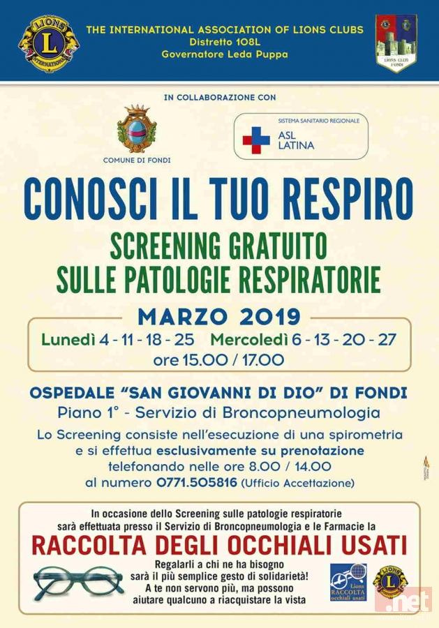 Il Lions Club Fondi - Distretto Lions 108 (governatore Leda Puppa), in collaborazione con il Comune di Fondi e la ASL di Latina promuove per tutto il mese di Marzo 2019 lo Screening gratuito sulle patologie respiratorie “Conosci il tuo respiro”.