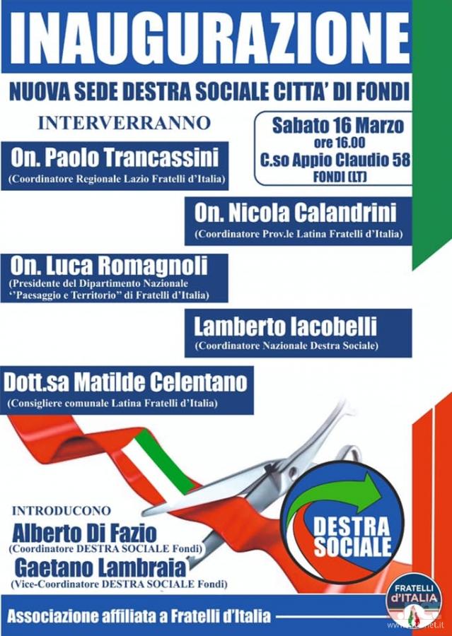 E' molto importante - aggiunge il vice coordinatore  Gaetano Lambraia - stare vicino ai cittadini, offrire un possibile aiuto e per farlo non c'è modo migliore che disporre di un luogo fisico in cui accogliere la gente e dare loro la possibilità di esporre le proprie problematiche". Continua il vice coordinatore Lambraia “siamo molto emozionati per questa inaugurazione, che vedrà tutti noi di Destra Sociale Fondi impegnati in prima persona, questo sarà solo l’inizio chiaramente, saranno molte le iniziative politiche che il gruppo è intenzionato a fare, sicuramente l’impegno di ognuno di noi è rivolto a fare più di quanto abbiamo fatto fin’ora”...” infatti il nostro primo impego a breve sarà quello di promuovere la campagna elettorale a favore del nostro rappresentante leader Onorevole Luca Romagnoli, candidato alle prossime elezioni europee del 26 maggio, con Fratelli d’Italia”..... “continuando a parlare del luogo in cui è ubicata la nostra nuova sede politica mi piace sottolineare che essa è sita nel cuore della città, dove non a caso, proprio di fronte,  c'era la vecchia sede dell' MSI, che negli anni si e'resa palcoscenico di molte apparizioni di Giorgio Almirante.
