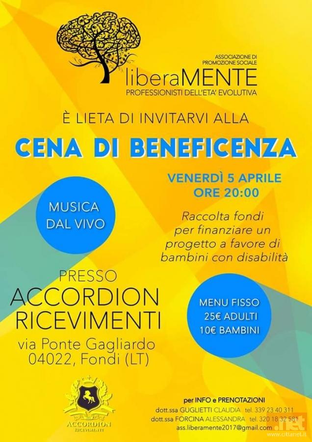 Visto l'enorme e inaspettato successo dello scorso anno, per il secondo anno consecutivo l'associazione di promozione sociale LiberaMENTE, che si occupa di bambini con disordini del neurosviluppo (principalmente disturbi dello spettro autistico), organizza per venerdì 5 Aprile 2019 una CENA DI BENEFICENZA presso il ristorante ACCORDION RICEVIMENTI.