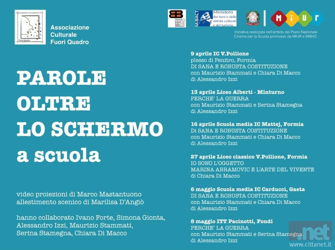 Dal 9 aprile all’8 maggio sei appuntamenti di cinema arrivano nelle scuole medie e superiori di Formia, Gaeta, Minturno e Fondi grazie alla rassegna“Parole oltre lo schermo” organizzata dall’associazione Fuori Quadro in collaborazione con il Teatro Bertolt Brecht di Formia nell’ambito del Piano nazionale “Cinema per la scuola” promosso da Miur e Mibac.