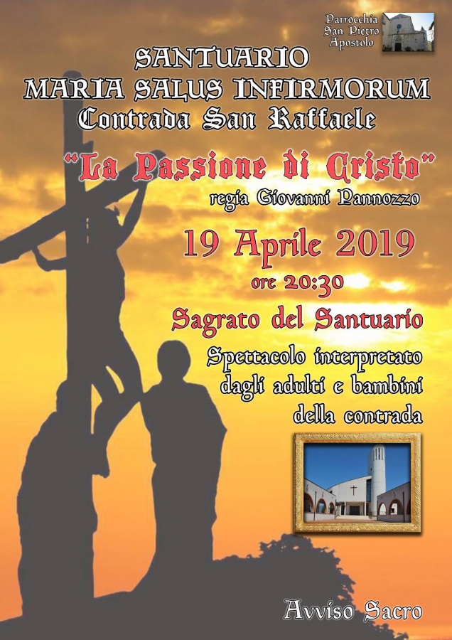 La Sacra Rappresentazione del Venerdì Santo andrà in scena nella splendida cornice del Santuario Maria Salute degli Infermi (contrada San Raffaele) il 19 Aprile 2019 alle ore 20:30.