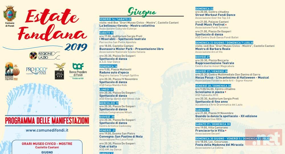 Il Sindaco di Fondi Salvatore De Meo e l’Assessore alla Cultura Beniamino Maschietto informano che è stato predisposto il programma delle iniziative dell’Estate Fondana 2019, che dal mese di Giugno si protrarrà fino alla fine di Settembre.