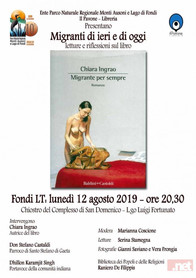 Lunedì 12 agosto 2019 alle ore 20,30, l’Ente Parco Naturale Regionale  Monti Ausoni e Lago di Fondi, in collaborazione con “Il Pavone” Libreria, presentano il libro di Chiara Ingrao “Migrante per sempre”.