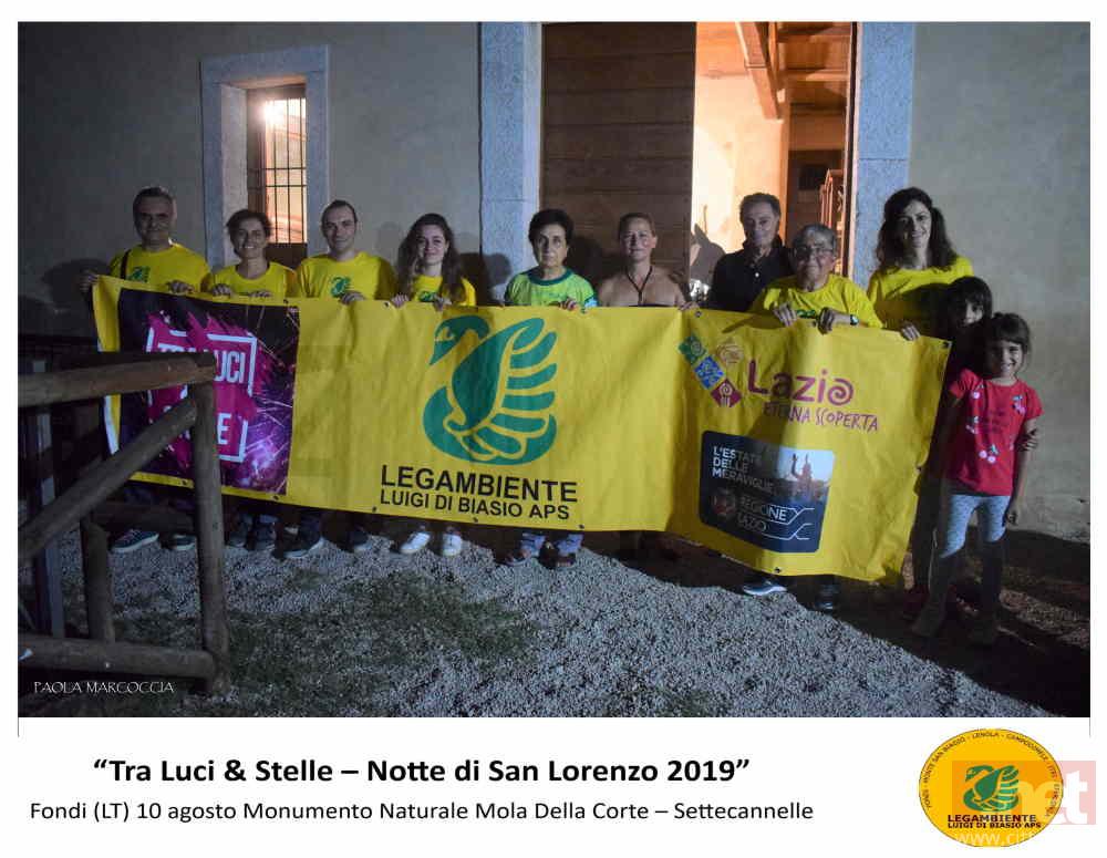 Grande successo per l’iniziativa “Tra Luci & Stelle – Notte di San Lorenzo 2019” organizzata dal Circolo Legambiente Intercomunale “Luigi Di Biasio” APS nell’ambito delle manifestazioni della Regione Lazio “L’Estate delle Meraviglie” presso il Monumento Naturale Mola Della Corte – Settecannelle a Fondi. L’evento ha avuto il patrocinio del Parco Naturale Regionale dei Monti Aurunci ed ha dato la possibilità di osservare al telescopio la Luna e i pianeti Giove e Saturno, ascoltare interventi musicali a tema e visitare una mostra fotografica sul cielo e l’inquinamento luminoso. Dopo una presentazione del prof. Pino Casale sul cielo notturno, che ha toccato le ricerche in corso nell’ambito dell’esplorazione umana dello spazio e i legami dell’astronomia con la pittura e la musica, è stato offerto un buffet plastic free con prodotti locali. I numerosi visitatori (almeno 300) hanno così potuto apprezzare le potenzialità di Mola della Corte – Settecannelle, un luogo di alto pregio naturalistico a breve distanza dal centro abitato di Fondi.