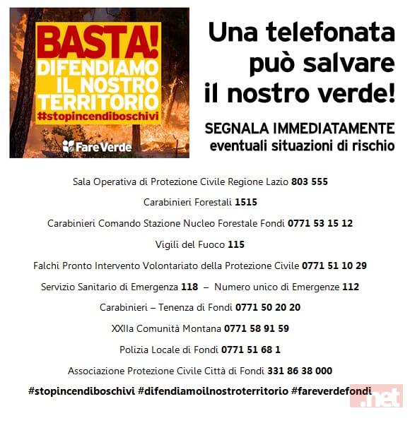 Per questo rivolgiamo un Appello a tutti i Cittadini di Fondi e del comprensorio: una telefonata può salvare il nostro territorio! Invitiamo tutti alla massima attenzione, ed a segnalare immediatamente eventuali situazioni di rischio. Qui di seguito trovate i recapiti telefonici delle Autorità e delle organizzazioni competenti in materia: