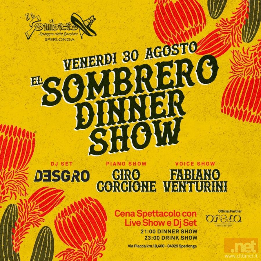 Il piano show di Ciro Corcione, il dj set di Desgro e Fabiano Venturini e le specialità di chef di Igor Margotti: sarà una serata d'autore, sotto le stelle di una magnifica terrazza vista mare quella in programma domani venerdì 30 agosto a “El Sombrero” di Sperlonga.