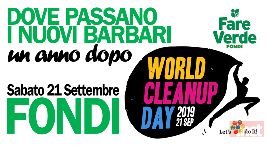 L'Associazione Ambientalista "Fare Verde" Fondi ha aderito ufficialmente al “World Clean Up Day” 2019, la più grande azione civica internazionale alla quale prenderanno parte Volontari di 150 Paesi nel mondo. Immaginate una potente "onda verde" che inizierà in Giappone e terminerà alle Hawaii, con milioni di persone pronte ad intraprendere azioni positive insieme, lo stesso giorno.