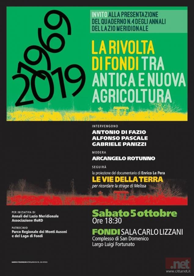 A cinquant’anni dalla “rivolta delle arance” avvenuta a Fondi il 3 febbraio 1969, è uscito per i Quaderni di Annali del Lazio Meridionale, il testo “1969 – 2019. La rivolta di Fondi. Tra antica e nuova agricoltura”, di Antonio Di Fazio e Alfonso Pascale, ed. Di Rienzo.