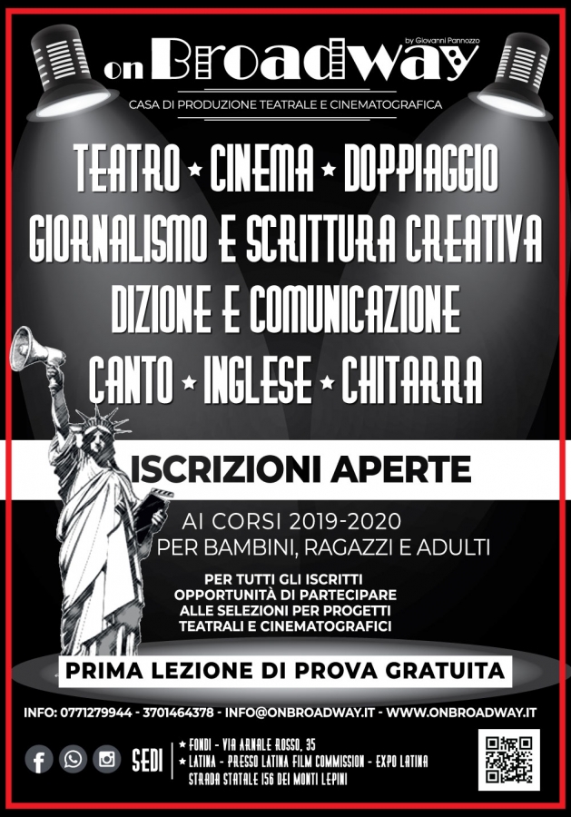 Occasioni che hanno permesso già a molti di partecipare alle selezioni di progetti teatrali e cinematografici, semplicemente frequentando il corso. Un’occasione più unica che rara e solo una delle attività di On Broadway, che, quest’anno si svolgeranno anche nel capoluogo presso la “Latina Film Commission” dove è in programma, per mercoledì 9 ottobre, un incontro a porte aperte per tutti gli interessati.