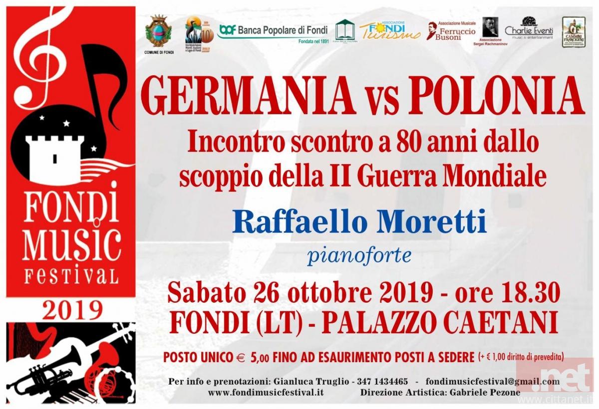 Il concerto  vedrà esibirsi il giovane e talentuoso pianista sardo Raffaello Moretti e il programma proposto – dal titolo “Germania Vs Polonia - Incontro/scontro a 80 anni dallo scoppio della II Guerra mondiale” – prevede l’esecuzione dei seguenti brani: Ciaccona in Re minore BWV 1004 (J.S. Bach - F. Busoni); Sonata per pianoforte n 21 in Do maggiore op. 53 “Waldstein”: Allegro con brio, Introduzione: adagio molto, Rondò (L.v. Beethoven); ​24 preludi op. 28 (F. Chopin).