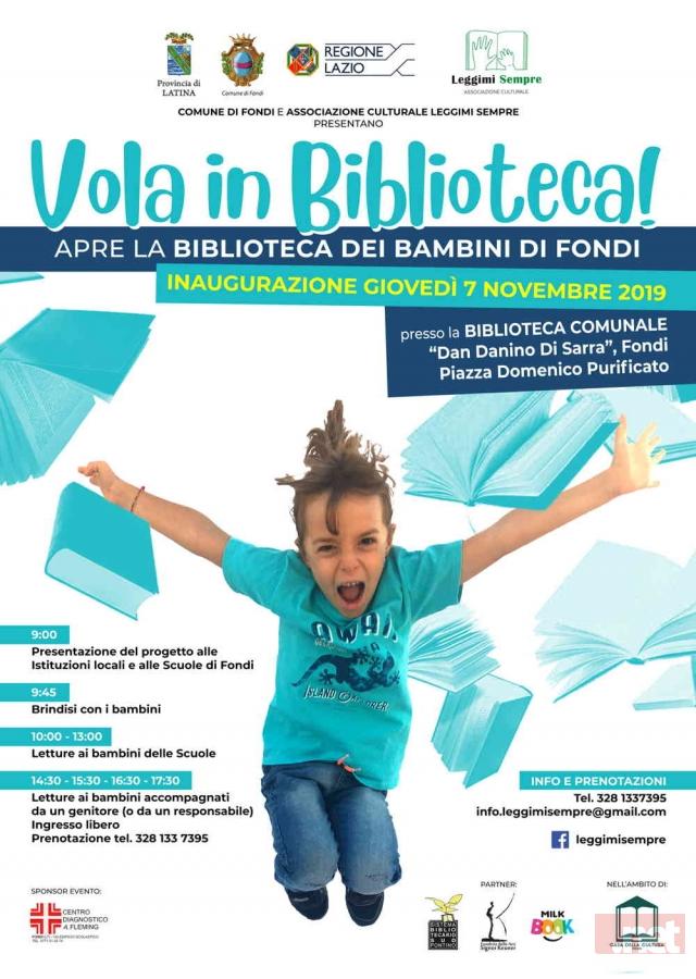 Giovedì 7 novembre 2019, dalle 9.00 alle 18.30, con una giornata ricca di letture e sorprese, debutta la prima “Biblioteca dei Bambini di Fondi”: il nuovo corner per la lettura dei bambini da 0 a 10 anni, situato al piano terra della Biblioteca Comunale “Dan Danino di Sarra”.