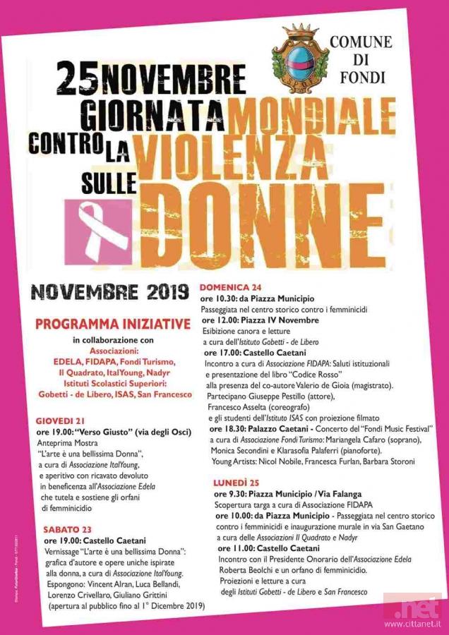 Domenica 24, alle ore 10.30 muoverà da Piazza Municipio verso il centro storico una passeggiata contro i femminicidi, che si concluderà alle 12.00 in piazza IV Novembre con un’esibizione canora e letture a cura dell’Istituto Gobetti - de Libero. Alle 17.00 presso la Sala convegni del Castello Caetani è in programma un incontro a cura di Associazione FIDAPA. Dopo i saluti istituzionali del Sindaco Salvatore De Meo e della Presidente della Commissione Pari opportunità e Parità di genere Rita Di Fazio avrà luogo la presentazione del libro “Codice Rosso” alla presenza del magistrato Valerio de Gioia, co-autore del volume con Gian Ettore Gassani. Partecipano l’attore Giuseppe Pestillo, il coreografo Francesco Asselta e gli studenti dell’Istituto ISAS, che proietteranno un filmato da loro realizzato. La giornata proseguirà alle 18.30 presso la Sala Grande di Palazzo Caetani con il Concerto del “Fondi Music Festival”, a cura dell’Associazione Fondi Turismo. Ad esibirsi saranno Mariangela Cafaro (soprano), Monica Secondini e Klarasofia Palaferri (pianoforte). Young Artists: Nicol Nobile, Francesca Furlan, Barbara Storoni.