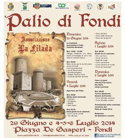 L’Assessore al Turismo del Comune di Fondi Beniamino Maschietto rende noto che da Domenica 29 Giugno p.v. nel Centro storico e presso il Teatro all’aperto di Piazza Alcide De Gasperi avrà inizio la terza edizione del “Palio di Fondi”, che dopo la giornata inaugurale riprenderà Venerdì 4 Luglio per poi concludersi Domenica 6.