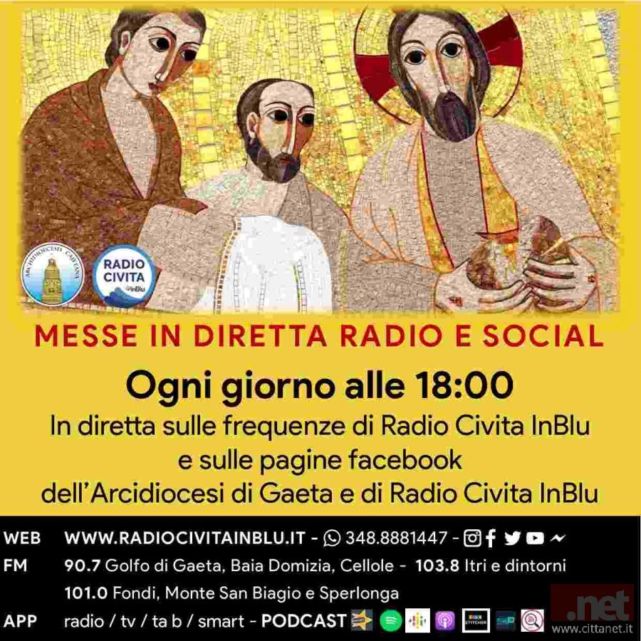 Dal 9 marzo, ogni giorno alle 18.00, sarà trasmessa da una parrocchia della Arcidiocesi di Gaeta la Santa Messa. Da ascoltare sulle frequenze di Radio Civita InBlu e guardare sulle pagine Facebook dell'Arcidiocesi di Gaeta e di Radio Civita InBlu.