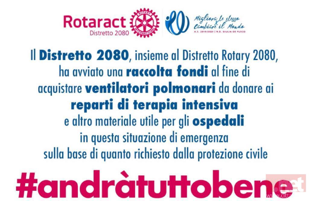 In seguito alla situazione di emergenza che il nostro Paese sta fronteggiando in queste settimane, il Distretto Rotaract 2080, insieme al Distretto Rotary 2080, ha avviato una raccolta fondi finalizzata a supportare le strutture ospedaliere attraverso la donazione di macchinari necessari nei reparti di terapia intensiva (es. ventilatori polmonari) e altro materiale utile, così come individuato dalla protezione civile con cui siamo costantemente in contatto.