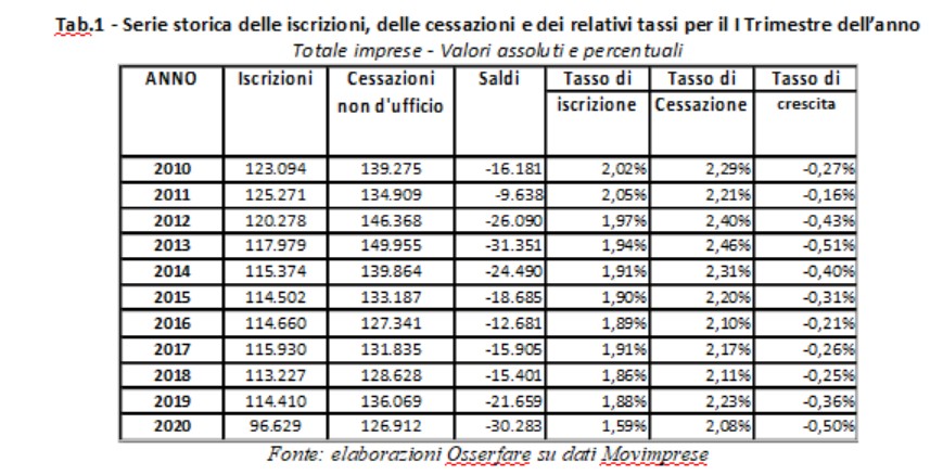 Secondo i dati forniti da Unioncamere relativi ai primi tre mesi del 2020 si è riscontrato in Italia un calo di quasi 30mila imprese (21mila lo erano state nel 2019). Il bilancio della nati-mortalità delle imprese a livello nazionale tra gennaio e marzo di quest’anno risente delle restrizioni seguite all'emergenza Covid-19 e rappresenta il saldo peggiore degli ultimi 7 anni, rispetto allo stesso arco temporale. Si tratta di un dato che evidentemente si riflette anche a livello territoriale e settoriale. Gli effetti conseguenti allo stato di eccezionalità in cui l'economia reale si sta muovendo appesantiscono il risultato di un bilancio che nei primi tre mesi dell’anno chiude sempre in rosso per effetto delle chiusure comunicate sul finire dell’anno precedente.