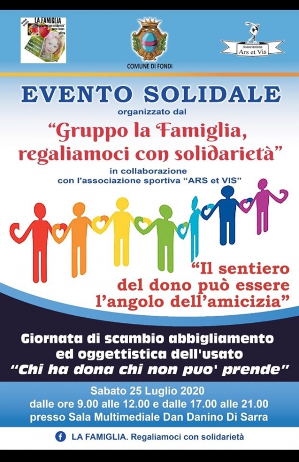 " Chi ha dona, chi non puo' prende" questo è il motto con cui il gruppo fecebook "LA FAMIGLIA, regaliamici con solidarietà " ha voluto organizzare un evento solidale di scambio. Il primo evento in provincia di Latina nel Comune di Fondi, che promuove lo scambio di oggetti ed abbigliamento in forma completamente gratuita. Grazie all'aiuto di diverse famiglie che hanno e continuano a donare ,alcuni membri del gruppo FB hanno voluto promuovere e divulgare l'iniziativa della condivisione.