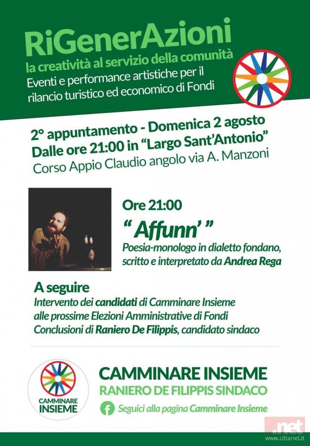 In questo appuntamento in scena Affunn’, monologo in dialetto fondano scritto e interpretato dall’artista Andrea Rega. In questa breve opera teatrale, pubblicata nel 2019 dalla casa editrice Ali Ribelli Editore, l’autore esprime il disagio generazionale della priorità città, in cui i sentimenti contrastanti verso le proprie origini si fondono per creare un’atmosfera di cupa speranza verso il proprio futuro.