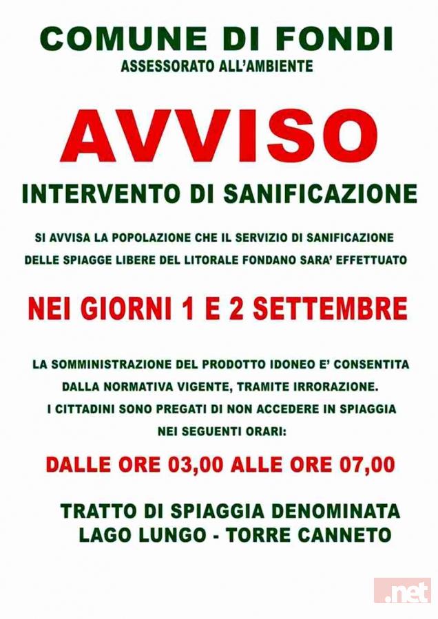 Un ulteriore intervento di sanificazione ambientale sulle spiagge libere del litorale, da Lago Lungo a Torre Canneto: è quanto annuncia l’Assessore all’Ambiente Roberta Muccitelli, che rende noto a cittadini e villeggianti che esso avrà luogo dalle ore 3.00 alle 7.00 di Martedì 1 e Mercoledì 2 Settembre prossimi.