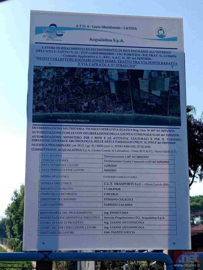 All'inizio di Agosto del 2020 in località Holiday e comparso come per magia un cartello che indicava lavori di (NUOVI COLLETTORI FOGNARI FONDI MARE: TRATTO DA VIA PONTE BARATTA A VIA CAPRATICA – 1° STRALCIO)...