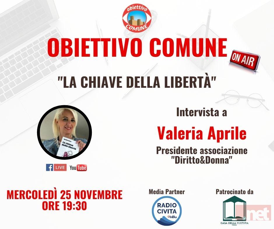 Domani, mercoledì 25, alle 19.30, Obiettivo Comune condurrà sul proprio profilo Facebook un webinar con ospite Valeria Aprile, avvocato, presidente dell’Associazione Diritto & Donna, e autrice del libro "La chiave della libertà", che tratta della violenza sulle donne.