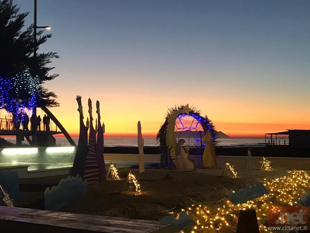 La magia delle luci di Natale, i colori del tramonto che sfumano fino a cedere il passo alla volta celeste, la suggestività del ponte e degli scorci marini, la collaborazione e la solidarietà di un'intera contrada che ha lavorato in sinergia per fare alla città un piccolo grande dono natalizio en plein air: c'è tutto questo e molto altro dietro il “Presepe sul mare”, inaugurato ieri in piazza Sant'Anastasia a Fondi.