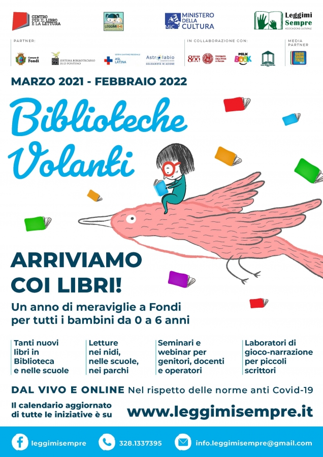 “Biblioteche Volanti” è un vero e proprio viaggio di un anno nella letteratura per bambini, iniziato il 12 aprile 2021 e in corso fino a febbraio 2022, che raggiungerà i 2mila piccoli lettori da 0 a 6 anni della città, dentro e fuori dalla biblioteca (www.leggimisempre.it).