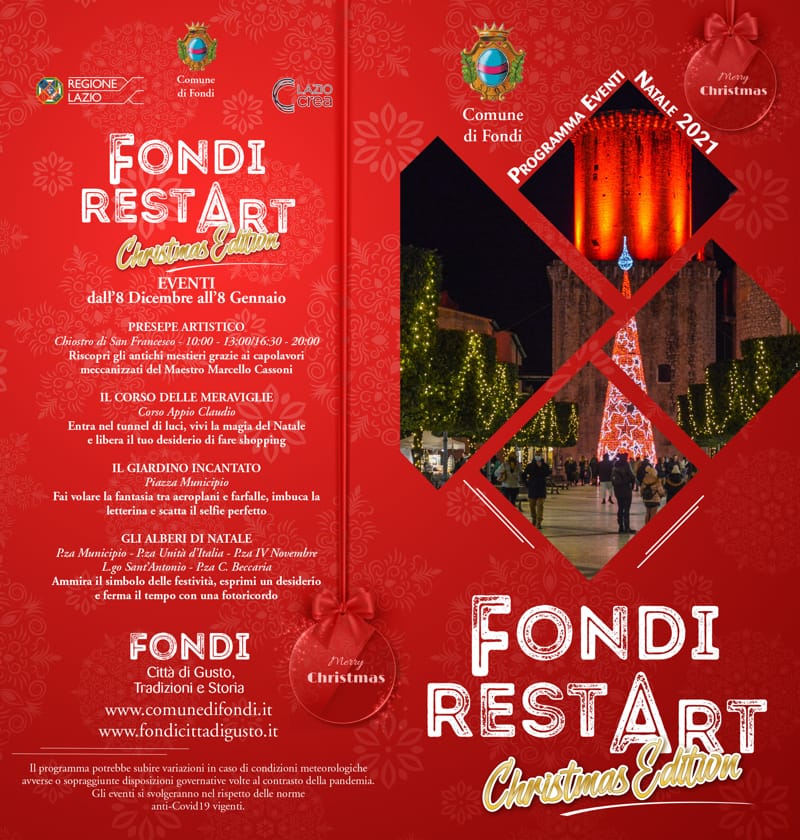 Eventi all'aperto per vivere la vera atmosfera natalizia in sicurezza, musica, spettacoli teatrali, mercatini, fiabe per bambini ed appuntamenti che fanno parte della tradizione della città: al via Fondi RestArt Christmas Edition, un mese di eventi nel cuore della città.