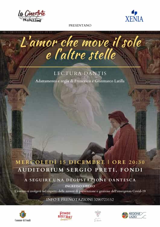 Non solo eventi natalizi, musica e tradizione nel programma di eventi natalizi “Fondi RestArt - Christmas Edition” ma anche cultura, teatro e un omaggio a Dante in occasione del settecentesimo anniversario dalla morte del sommo poeta. Dopo il grande successo dello scorso settembre, con l’evento risultato sold out in poche ore, i fratelli Francesco e Gianmarco Latilla tornano in scena con una Lectura Dantis intitolata “L’amor che move il sole e l’altre stelle”. L’evento teatrale si svolgerà nell’ampia e suggestiva location dell’auditorium comunale “Sergio Preti” mercoledì 15 dicembre a partire dalle 20:30.