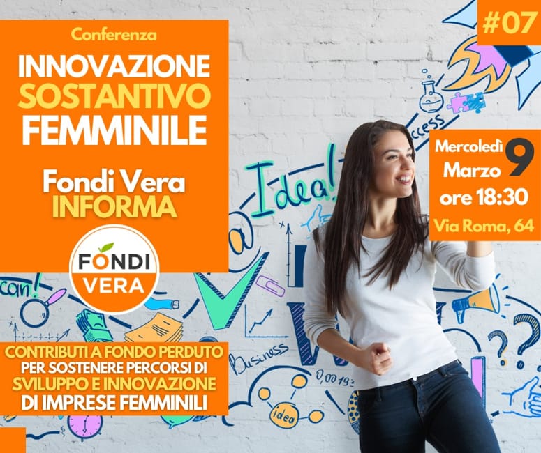 Il ciclo di appuntamenti "Fondi Vera informa", ripartito la scorsa settimana, propone il settimo incontro tematico, alle ore 18.30 di Mercoledì prossimo 9 Marzo, per presentare il Bando Regionale "Innovazione Sostantivo Femminile".