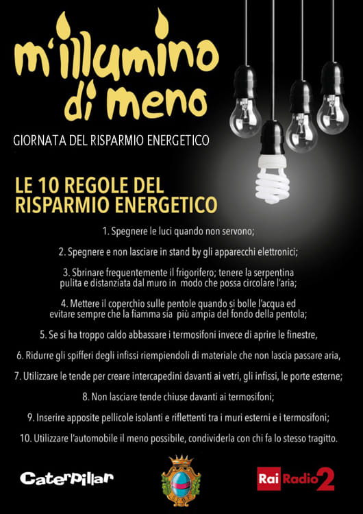 Anche quest'anno, e l’argomento non potrebbe essere più attuale, il Comune di Fondi aderisce a “Mi illumino di meno”, la Giornata del risparmio energetico e degli stili di vita sostenibili lanciata da Caterpillar e Radio 2 nel 2005.