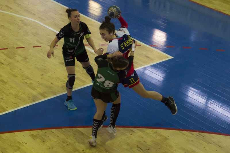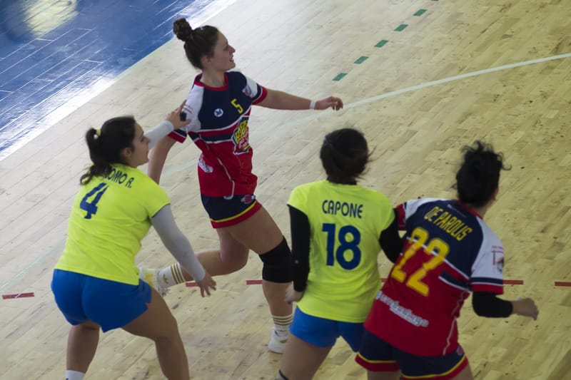 Le padrone di casa scendevano in campo con il chiaro intento di far propria l’intera posta in palio e, infatti, si portavano subito sul +3 (4-1 al 5°). Le fondane, dal canto loro, provavano a rientrare, ma erano le arpie ad allungare ulteriormente e a portarsi sull’8-4 a metà del primo tempo. Nella parte finale di tempo, però, usciva fuori il gioco corale delle rossoblù: con un netto parziale di 1-7, Manzo e compagne si portavano per la prima volta in vantaggio all’ultimo giro di lancette. Con la rete messa a segno proprio allo scadere da capitan Marino terminava un primo tempo dinamico, con gli attacchi che avevano decisamente la meglio sulle difese.
