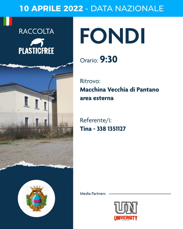 La partecipazione all’iniziativa è gratuita, basterà cliccare sul sito https://www.plasticfreeonlus.it/eventi/690/10-apr-fondi e registrarsi come Volontario per ricevere tutte le istruzioni necessarie. L’evento di Domenica 10 Aprile gode del Patrocinio del Comune di Fondi.