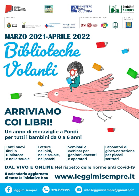 Ieri mattina, giovedì 7 aprile 2022, dalle 9:30 alle 11:30, presso la Biblioteca Comunale di Fondi “Dan Danino di Sarra” si è conclusa l’avventura di "Biblioteche Volanti": il lungo progetto letterario per gli oltre 2mila bambini da 0 a 6 anni di Fondi, realizzato dall’Associazione Culturale Leggimi Sempre grazie al bando ‘Leggimi 0-6’ del Cepell-Centro per il Libro e la Lettura (MIC) e con il cofinanziamento del Comune di Fondi.  Il progetto si è svolto in partenariato con il Sistema Bibliotecario Sud Pontino, la ASL di Latina (distretto Terracina-Fondi) e la Cooperativa Sociale Astrolabio di Fondi. Il media partner è stata Radio Show Italia 103e5.