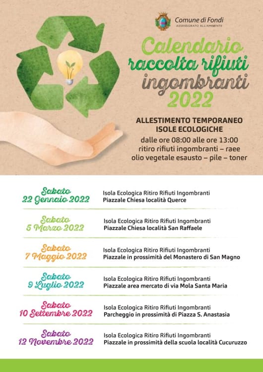 L’isola – ricordano il sindaco di Fondi Beniamino Maschietto e l’assessore all’Ambiente Fabrizio Macaro – può essere utilizzata, non solo per elettrodomestici, arredi e materassi, ma anche per pile, toner, olio vegetale esausto e per apparecchiature elettroniche. Durante tutto l’anno, invece, restano attive, gratuitamente, le isole di via Rezzola e via Covino e il numero verde 800.086.580 per la prenotazione della raccolta di ingombranti a domicilio.