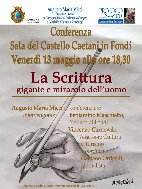 Per l’occasione è stato scelto lo sconfinato tema della scrittura, definita per l’occasione: gigante e miracolo dell’uomo. All’incontro aperto alla libera partecipazione di tutti, interverranno anche il sindaco di Fondi Beniamino Maschietto e l’assessore alla cultura e turismo Vincenzo Carnevale. A coordinare i lavori sarà Gaetano Orticelli, giornalista e presidente della Pro Loco Fondi.