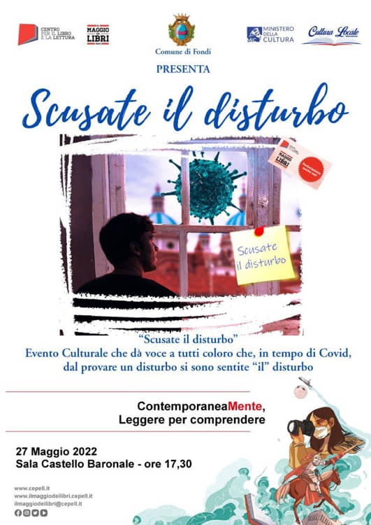 Dopo Moncalieri, Casale Monferrato e Aosta fa tappa anche a Fondi la serie di incontri “Scusate il disturbo”. L’evento culturale, organizzato da Zetatielle Magazine con il patrocinio del Comune di Fondi nell’ambito del “Maggio dei Libri”, affronta il delicato tema delle malattie terminali e si propone di dare voce a chi, in particolare nell’era della pandemia, dal provare un disturbo si è trovato nella condizione di essere “il” disturbo. L’appuntamento è in programma venerdì 27 maggio alle 17:30, presso la sala conferenze del Castello.