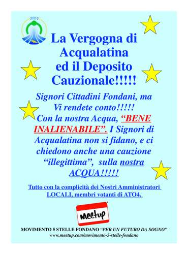 Il gruppo Movimento 5 Stelle Fondano"Per un futuro da Sogno" ha organizzato per domenica 16 novembre dalle 10.00 alle 20.00 presso piazza Matteotti, un banchetto informativo sull'acqua pubblica contro Acqualatina e la Vergognosa Cauzione chiesta ai cittadini, già gravati di tasse e imposte comunali e statali, in questi tempi di pura recessione economica.