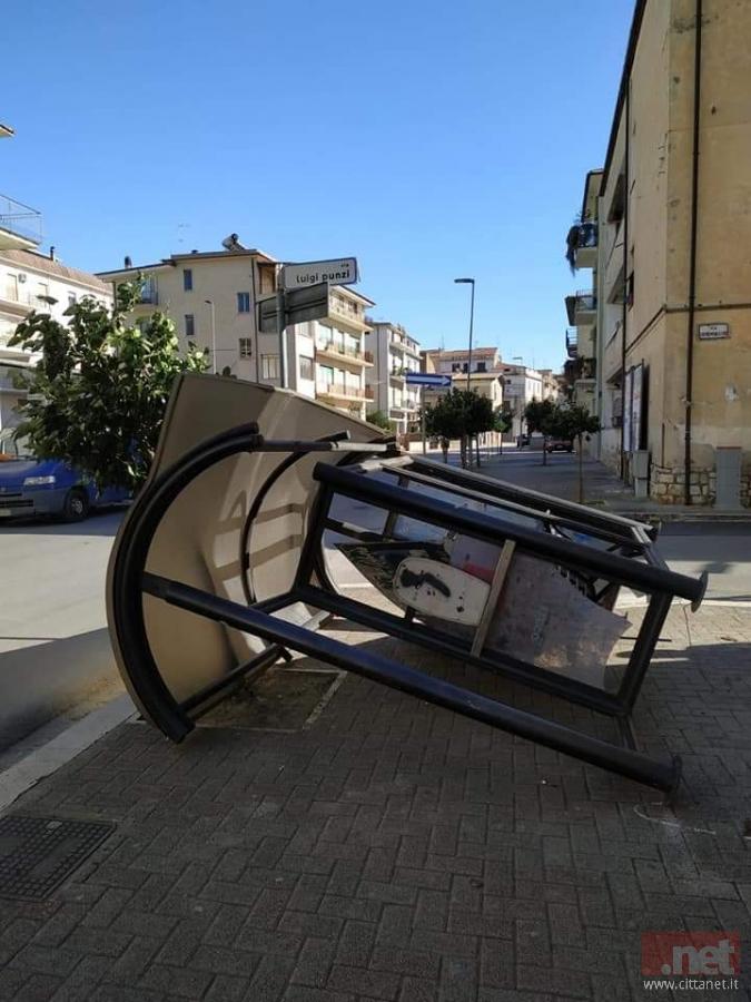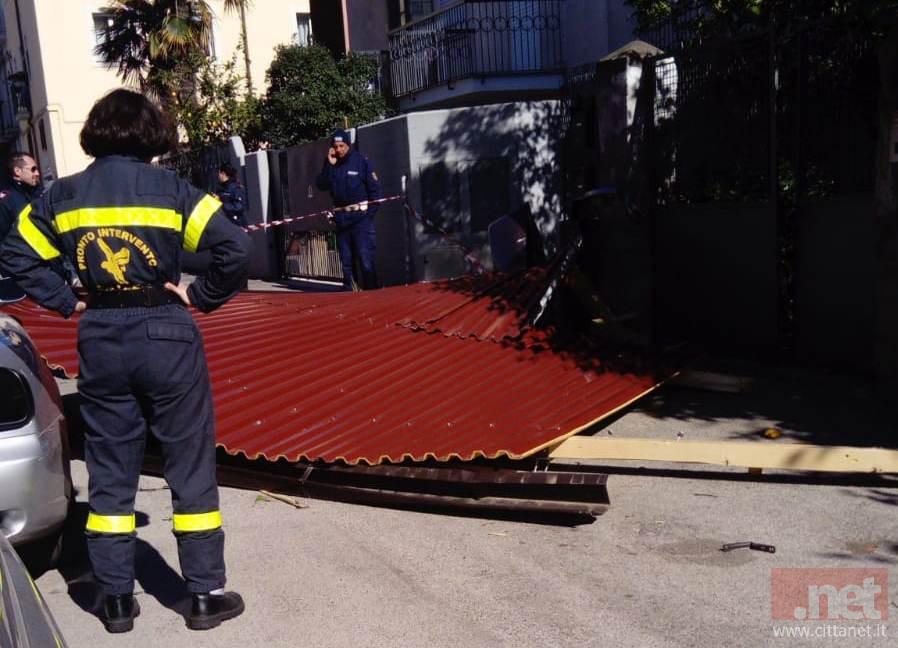 Sradicata una pensilina in via Fabio Filzi, diverse auto danneggiate. Danni anche alle scuole Garibaldi, dove il vento ha strappato i pannelli fotovoltaici di recente installazione, e alla Purificato.