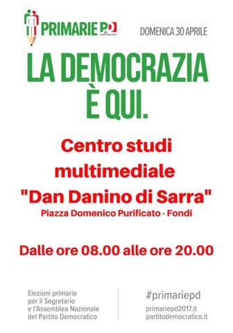 È tempo di primarie e anche tutti i fondani del PD, iscritti al partito o simpatizzanti sono chiamati a votare. “La democrazia è qui” recita il manifesto nazionale che invita tutti i membri del partito domenica 30 aprile presso il centro multimediale Dan Danino Di Sarra di Fondi a esprimere la propria preferenza. Come nel resto d'Italia, dalle ore 8:00 alle ore 20:00 si terranno quindi le elezioni primarie per il segretario e l’assemblea nazionale del Partito Democratico.