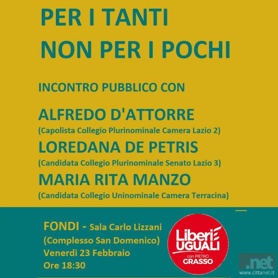 “Per tanti, non per poch” è lo slogan del movimento. A incontrare l’elettorato saranno Alfredo D'Attorre (capolista Camera dei Deputati Lazio 2), Loredana De Pretis (candidata al Senato della Repubblica Lazio 3) e Maria Rita Manzo (candidata alla Camera dei Deputati).