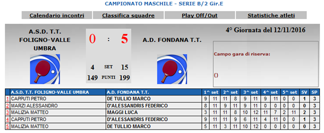 Seconda vittoria e secondo 5-0 consecutivo per la Fondana 1 nel campionato di B2, girone E. Sabato 12 novembre, la prima squadra di Fondi non ha avuto alcun problema a conquistare i due punti, in casa della A.S.D. T.T. Foligno-Valle umbra, grazie sia alle due vittorie dei “bombardieri” De Tullio e D’Alessandris, pronti a toppare qualunque cosa passi dalle parti delle loro racchette, che alla vittoria dell’esperto Maggi.