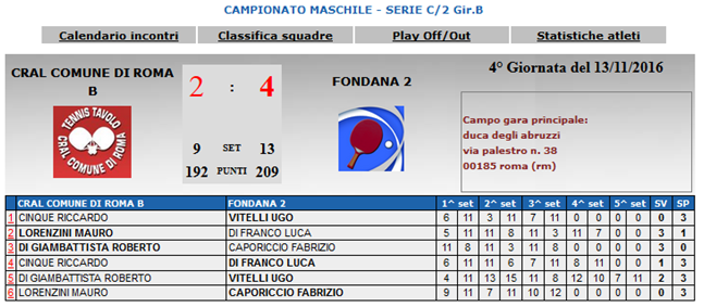 Domenica 13 in C2, invece, la Fondana 2 si giocava il primo posto in classifica in casa dell’altra capolista, il CRAL comune di Roma B, con tutte le premesse per una partita combattuta e avvincente. Entrambe a punteggio pieno, le due squadre hanno messo in campo le formazioni collaudate che avevano fino ad allora fruttato tre vittorie in altrettante giornate. In una partita nella quale Di Franco ha conquistato stranamente solo un punto e anche Vitelli, per prendersi il secondo, ha dovuto sudare fino al quinto set, l’onore e l’onere di giocare l’ultima partita, quella fondamentale per la vittoria, è toccato al capitano Caporiccio, ancora in cerca del suo equilibrio nella nuova stagione agonistica.